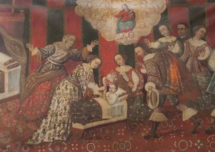 La salutazione angelica sia per noi consolazione e protezione nelle angosce e nelle necessità, così come per San Tommaso si trasformò in stendardo, scudo e baluardo nelle battaglie Il piccolo Tommaso riceve dal Cielo un manoscritto con la Salutazione Angelica - Convento di San Domenico, Lima