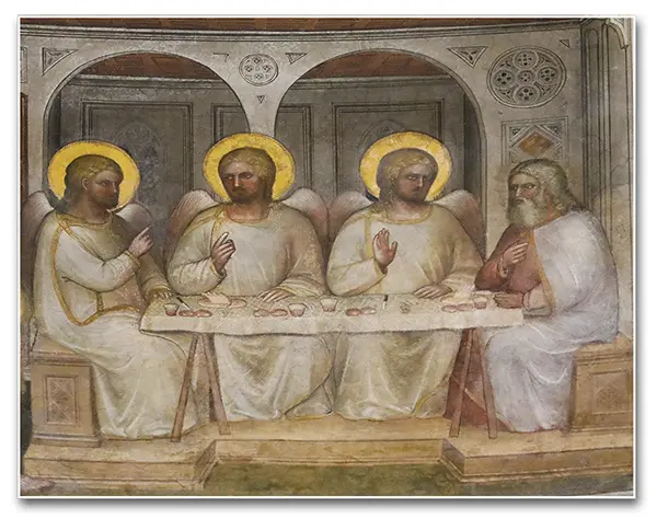 Abramo aveva già novantanove anni e Sara fino ad allora non gli aveva dato un figlio. In un caldo pomeriggio, mentre era seduto alla porta della sua tenda, vide davanti a sé tre uomini, che in realtà erano tre Angeli. Con grande zelo e ospitalità, il patriarca si mise a servirli e loro gli predissero che sarebbero tornati entro un anno e che, per quel tempo, gli sarebbe nato un figlio. E così avvenne.