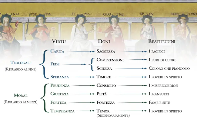 San Tommaso d’Aquino stabilisce un’interessante corrispondenza tra le virtù infuse, i doni dello Spirito Santo e le beatitudini evangeliche. La virtù della carità, ad esempio, è perfezionata dal dono della sapienza, che ci annovera nel numero dei pacifici, meritevoli di essere chiamati figli di Dio (cfr. Mt 5, 9). La speranza, a sua volta, si perfeziona con il dono del timore, che ci rende poveri in spirito, possessori del Regno dei Cieli (cfr. Mt 5, 3). E così via.