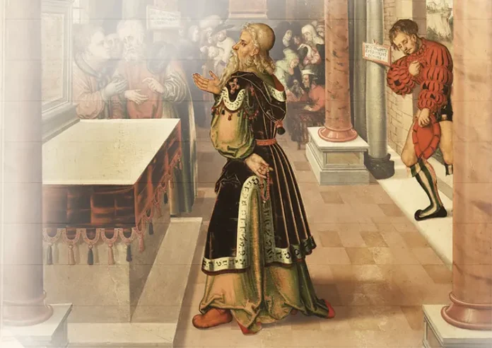 Il primo, in piedi, rende grazie a Dio per non essere peccatore come gli altri uomini; si vanta delle sue virtù, non chiede al Signore né aiuto né perdono per le sue colpe. Il secondo si mantiene a distanza, riconoscendo la propria indegnità, abbassa il capo, ammette di essere peccatore e implora l’Altissimo di essergli propizio. Il Divin Maestro afferma che il pubblicano uscì dal Tempio giustificato, ma il fariseo no, perché «Dio resiste ai superbi, agli umili invece dà la sua grazia» (Gc 4, 6).